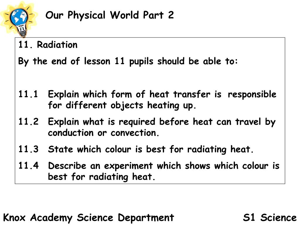 Our Physical World Part 2 11. Radiation By the end of lesson 11 pupils should be able to: 11.1 Explain which form of heat transfer is responsible for different objects heating up. 11.2 Explain what is required before heat can travel by conduction or convection. 11.3 State which colour is best for radiating heat. 11.4 Describe an experiment which shows which colour is best for radiating heat. Knox Academy Science Department S1 Science