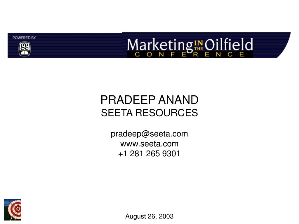 PRADEEP ANAND SEETA RESOURCES pradeep@seeta.com www.seeta.com +1 281 265 9301 August 26, 2003. MARKETING & COMMERCIALIZING OILFIELD TECHNOLOGIES President, Co-founder, PointCross VP Marketing, Landmark Graphics First marketing manager for LWD/MWD at Sperry-Sun