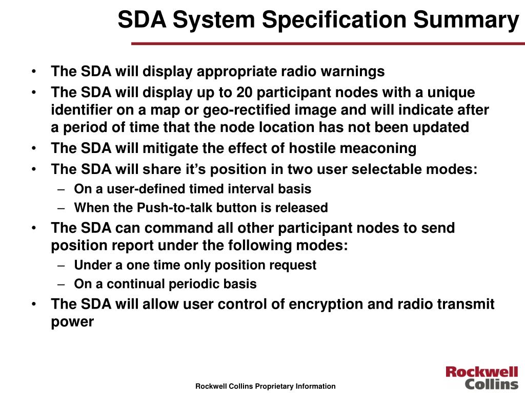 SDA System Specification Summary • The SDA will display appropriate radio warnings • The SDA will display up to 20 participant nodes with a unique identifier on a map or geo-rectified image and will indicate after a period of time that the node location has not been updated • The SDA will mitigate the effect of hostile meaconing • The SDA will share it’s position in two user selectable modes: • On a user-defined timed interval basis • When the Push-to-talk button is released • The SDA can command all other participant nodes to send position report under the following modes: • Under a one time only position request • On a continual periodic basis • The SDA will allow user control of encryption and radio transmit power