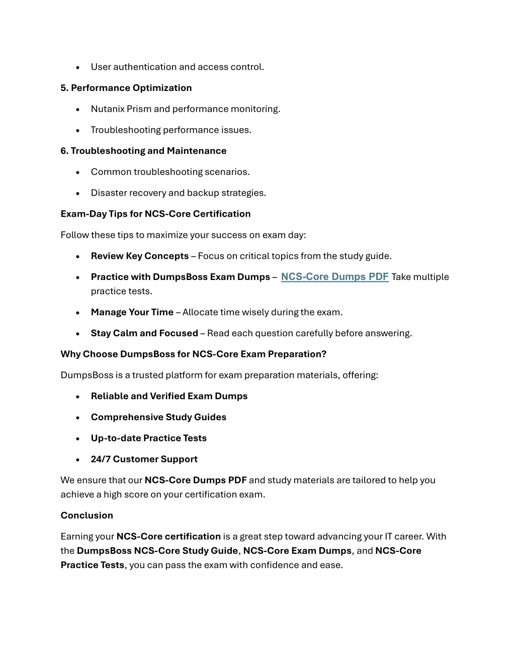 •User authentication and access control. 5. Performance Optimization •Nutanix Prism and performance monitoring. •Troubleshooting performance issues. 6. Troubleshooting and Maintenance •Common troubleshooting scenarios. •Disaster recovery and backup strategies. Exam-Day Tips for NCS-Core Certification Follow these tips to maximize your success on exam day: •Review Key Concepts – Focus on critical topics from the study guide. •Practice with DumpsBoss Exam Dumps – NCS-Core Dumps PDF Take multiple practice tests. •Manage Your Time – Allocate time wisely during the exam. •Stay Calm and Focused – Read each question carefully before answering. Why Choose DumpsBoss for NCS-Core Exam Preparation? DumpsBoss is a trusted platform for exam preparation materials, offering: •Reliable and Verified Exam Dumps •Comprehensive Study Guides •Up-to-date Practice Tests •24/7 Customer Support We ensure that our NCS-Core Dumps PDF and study materials are tailored to help you achieve a high score on your certification exam. Conclusion Earning your NCS-Core certification is a great step toward advancing your IT career. With the DumpsBoss NCS-Core Study Guide, NCS-Core Exam Dumps, and NCS-Core Practice Tests, you can pass the exam with confidence and ease.