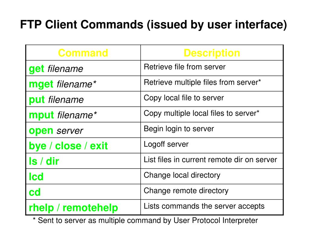 FTP Client Commands (issued by user interface) * Sent to server as multiple command by User Protocol Interpreter