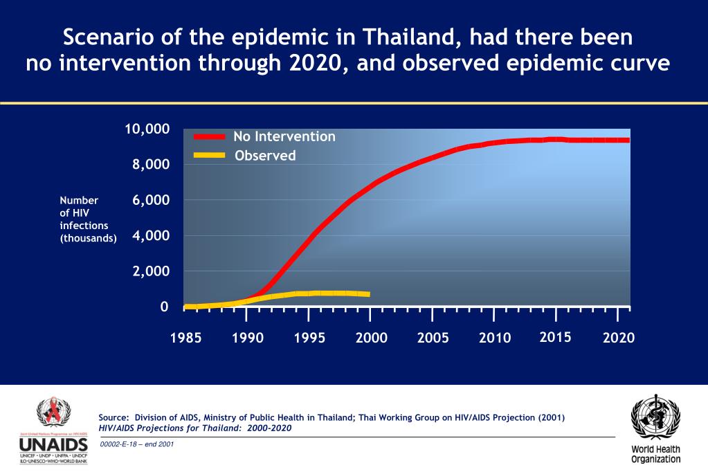 2015 1985 1990 1995 2000 2005 2010 2020 Scenario of the epidemic in Thailand, had there been no intervention through 2020, and observed epidemic curve 10,000 No Intervention Observed 8,000 6,000 Number of HIV infections (thousands) 4,000 2,000 0 Source: Division of AIDS, Ministry of Public Health in Thailand; Thai Working Group on HIV/AIDS Projection (2001) HIV/AIDS Projections for Thailand: 2000-2020