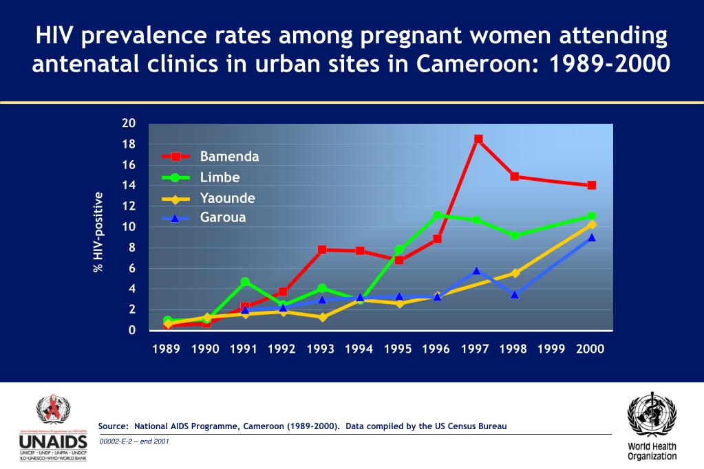 HIV prevalence rates among pregnant women attending antenatal clinics in urban sites in Cameroon: 1989-2000 20 18 Bamenda 16 Limbe 14 % HIV-positive Yaounde 12 Garoua 10 8 6 4 2 0 1989 1990 1991 1992 1993 1994 1995 1996 1997 1998 1999 2000 Source: National AIDS Programme, Cameroon (1989-2000). Data compiled by the US Census Bureau