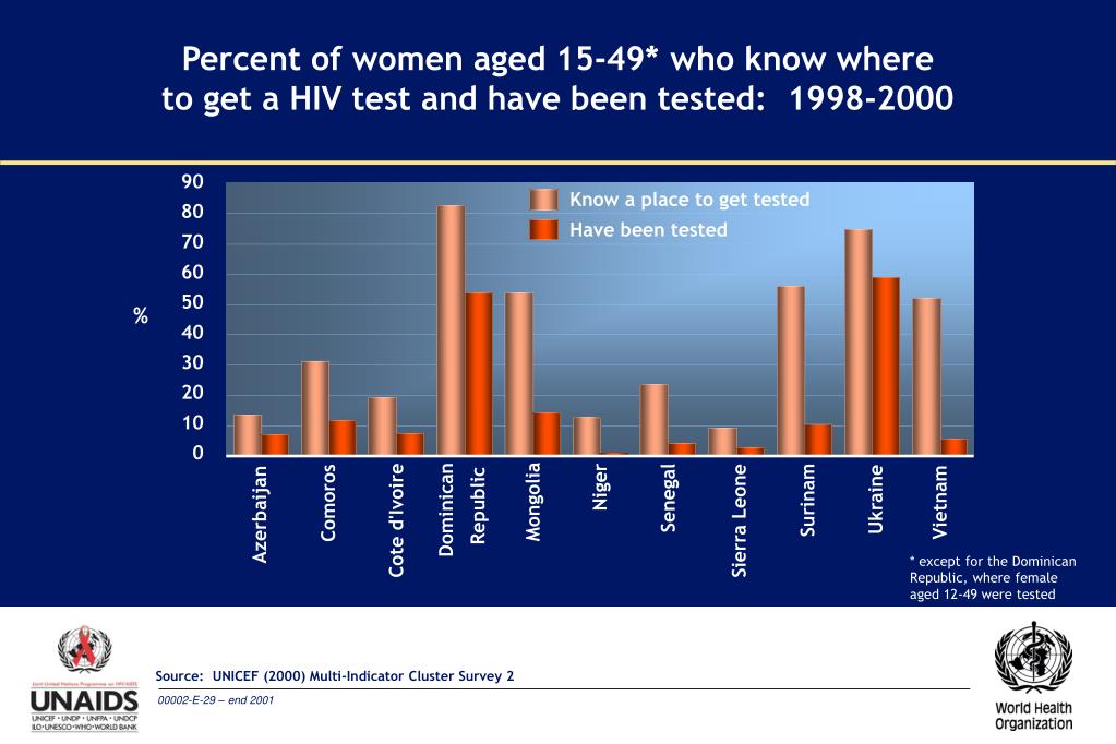 Percent of women aged 15-49* who know where to get a HIV test and have been tested: 1998-2000 90 Know a place to get tested 80 Have been tested 70 60 50 % 40 30 20 10 0 Niger Senegal Ukraine Surinam Mongolia Vietnam Comoros Republic Dominican Azerbaijan Cote d'Ivoire Sierra Leone * except for the Dominican Republic, where female aged 12-49 were tested Source: UNICEF (2000) Multi-Indicator Cluster Survey 2