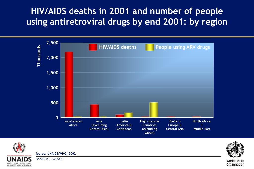 HIV/AIDS deaths in 2001 and number of people using antiretroviral drugs by end 2001: by region 2,500 HIV/AIDS deaths People using ARV drugs Thousands 2,000 1,500 1,000 500 0 sub-Saharan Africa Asia (excluding Central Asia) Latin America & Caribbean High -income Countries (excluding Japan) Eastern Europe & Central Asia North Africa & Middle East Source: UNAIDS/WHO, 2002