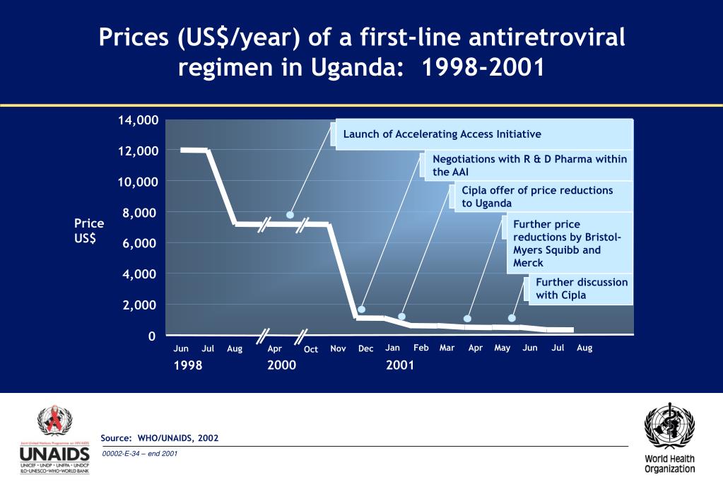 Prices (US$/year) of a first-line antiretroviral regimen in Uganda: 1998-2001 14,000 Launch of Accelerating Access Initiative 12,000 Negotiations with R & D Pharma within the AAI 10,000 Cipla offer of price reductions to Uganda 8,000 Price US$ Further price reductions by Bristol-Myers Squibb and Merck 6,000 4,000 Further discussion with Cipla 2,000 0 Jan Feb Mar Apr May Jun Jul Aug Jun Jul Aug Apr Nov Dec Oct 2000 2001 1998 Source: WHO/UNAIDS, 2002