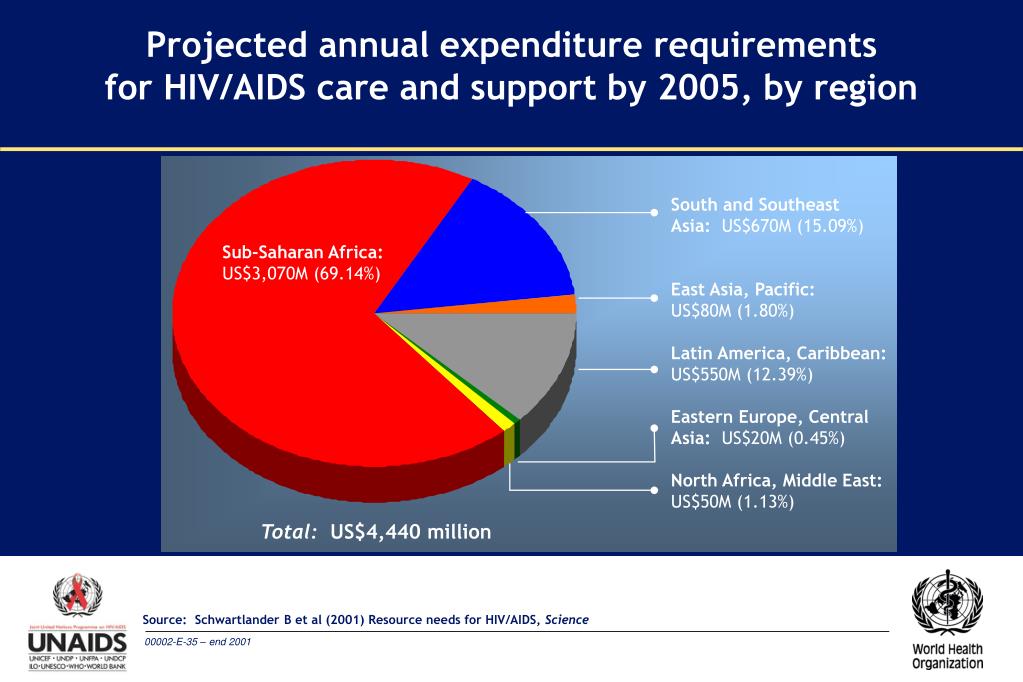Projected annual expenditure requirements for HIV/AIDS care and support by 2005, by region South and Southeast Asia: US$670M (15.09%) East Asia, Pacific: US$80M (1.80%) Latin America, Caribbean: US$550M (12.39%) Eastern Europe, Central Asia: US$20M (0.45%) North Africa, Middle East: US$50M (1.13%) Sub-Saharan Africa: US$3,070M (69.14%) Total: US$4,440 million Source: Schwartlander B et al (2001) Resource needs for HIV/AIDS, Science