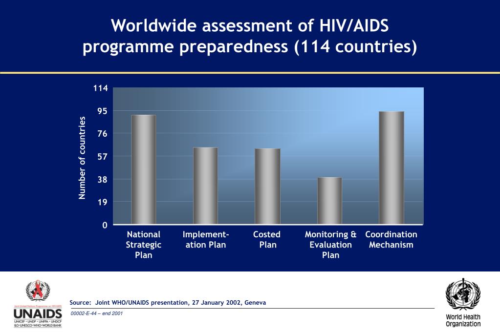 Worldwide assessment of HIV/AIDS programme preparedness (114 countries) 114 95 76 57 Number of countries 38 19 0 National Strategic Plan Implement- ation Plan Costed Plan Monitoring & Evaluation Plan Coordination Mechanism Source: Joint WHO/UNAIDS presentation, 27 January 2002, Geneva