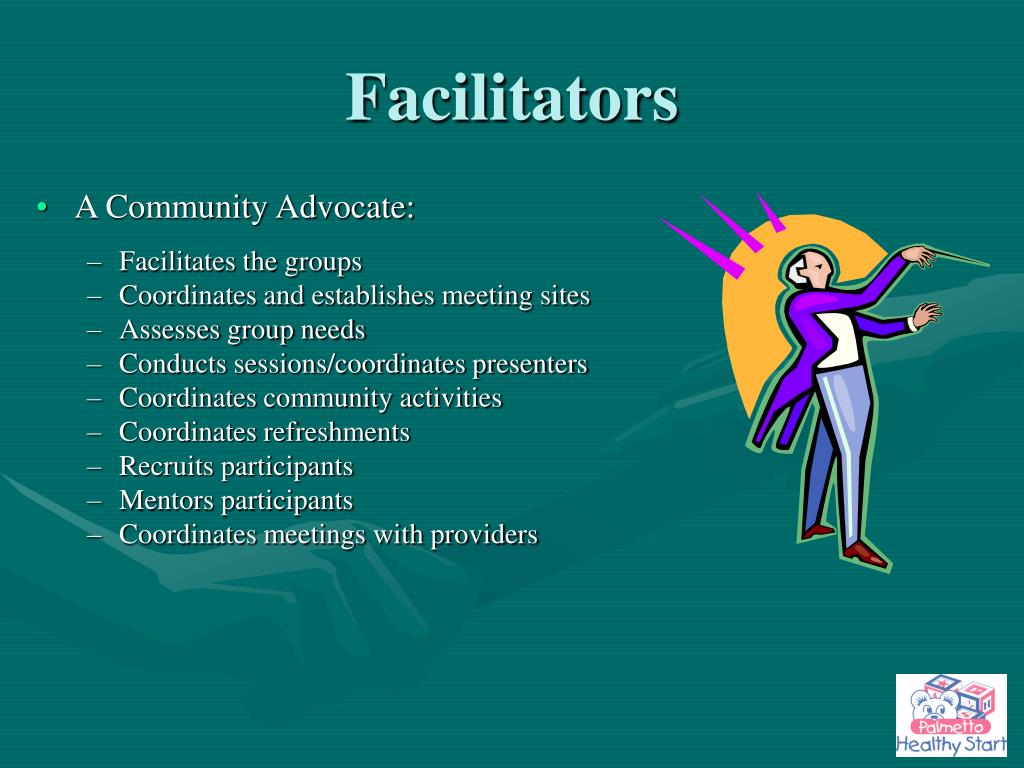 Facilitators • A Community Advocate: • Facilitates the groups • Coordinates and establishes meeting sites • Assesses group needs • Conducts sessions/coordinates presenters • Coordinates community activities • Coordinates refreshments • Recruits participants • Mentors participants • Coordinates meetings with providers