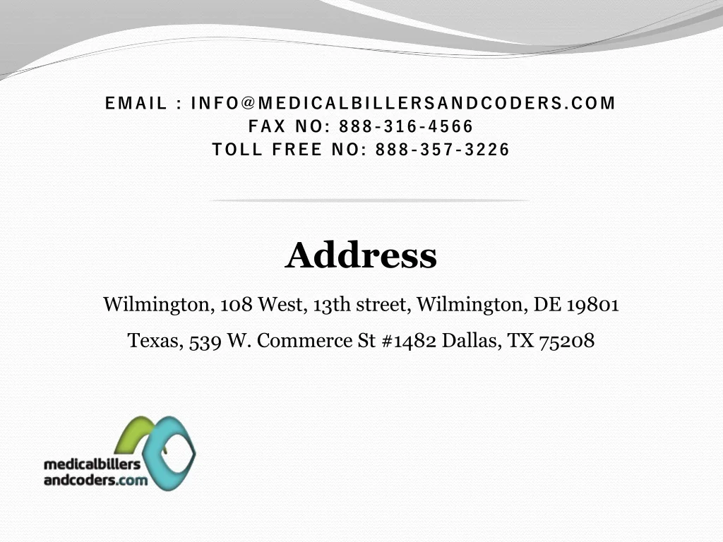 Email : info@medicalbillersandcoders.com Fax no: 888-316-4566 Toll Free no: 888-357-3226 AddressWilmington, 108 West, 13th street, Wilmington, DE 19801Texas, 539 W. Commerce St #1482 Dallas, TX 75208
