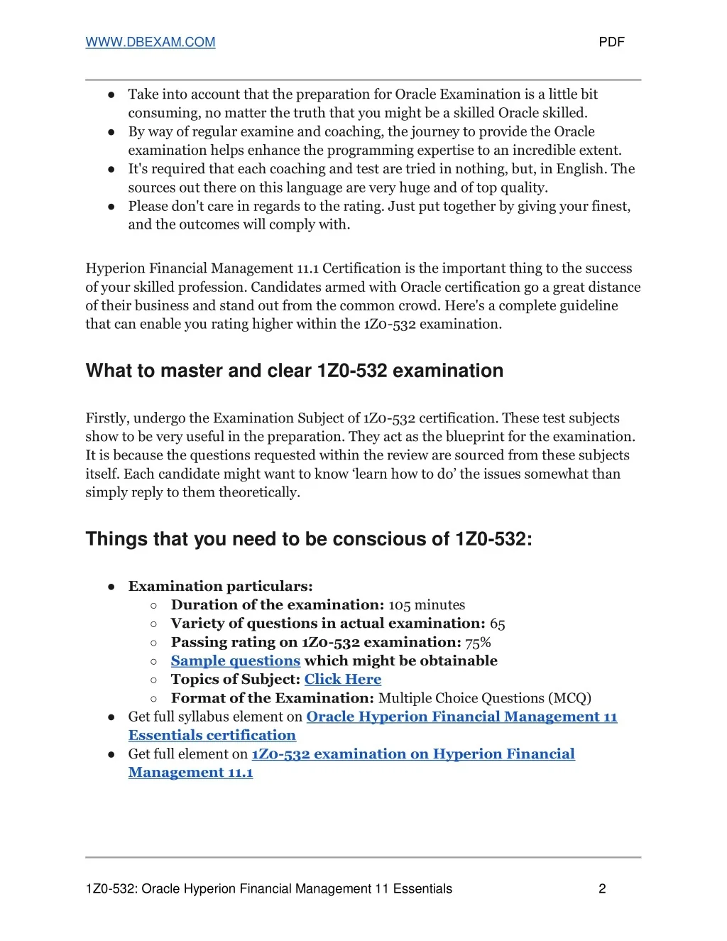 WWW.DBEXAM.COM PDF ●Take into account that the preparation for Oracle Examination is a little bit consuming, no matter the truth that you might be a skilled Oracle skilled. ●By way of regular examine and coaching, the journey to provide the Oracle examination helps enhance the programming expertise to an incredible extent. ●It's required that each coaching and test are tried in nothing, but, in English. The sources out there on this language are very huge and of top quality. ●Please don't care in regards to the rating. Just put together by giving your finest, and the outcomes will comply with. Hyperion Financial Management 11.1 Certification is the important thing to the success of your skilled profession. Candidates armed with Oracle certification go a great distance of their business and stand out from the common crowd. Here's a complete guideline that can enable you rating higher within the 1Z0-532 examination. What to master and clear 1Z0-532 examination Firstly, undergo the Examination Subject of 1Z0-532 certification. These test subjects show to be very useful in the preparation. They act as the blueprint for the examination. It is because the questions requested within the review are sourced from these subjects itself. Each candidate might want to know ‘learn how to do’ the issues somewhat than simply reply to them theoretically. Things that you need to be conscious of 1Z0-532: ●Examination particulars: ○Duration of the examination: 105 minutes ○Variety of questions in actual examination: 65 ○Passing rating on 1Z0-532 examination: 75% ○Sample questions which might be obtainable ○Topics of Subject: Click Here ○Format of the Examination: Multiple Choice Questions (MCQ) ●Get full syllabus element on Oracle Hyperion Financial Management 11 Essentials certification ●Get full element on 1Z0-532 examination on Hyperion Financial Management 11.1 1Z0-532: Oracle Hyperion Financial Management 11 Essentials 2
