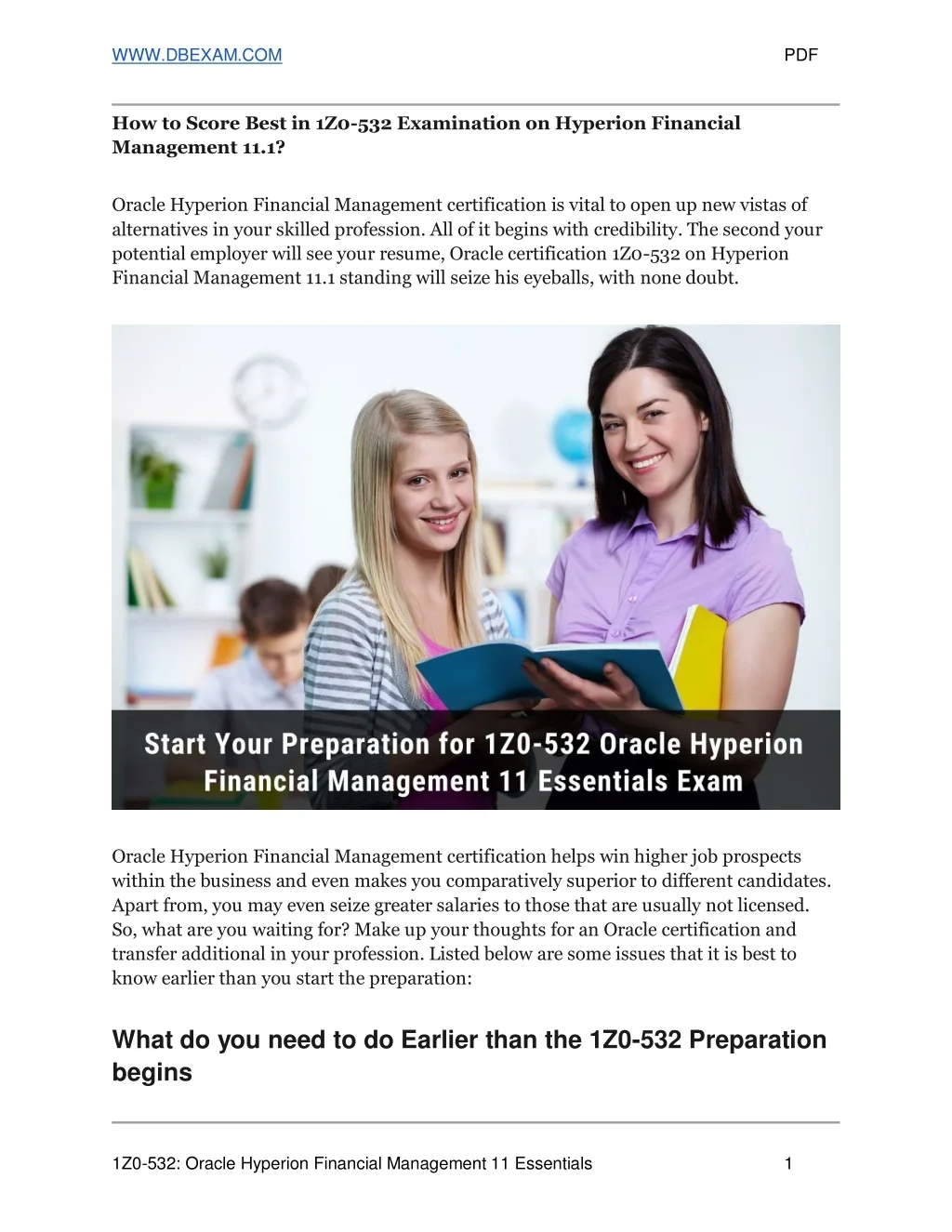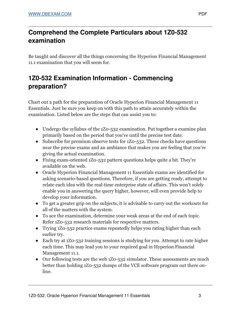 WWW.DBEXAM.COM PDF How to Score Best in 1Z0-532 Examination on Hyperion Financial Management 11.1? Oracle Hyperion Financial Management certification is vital to open up new vistas of alternatives in your skilled profession. All of it begins with credibility. The second your potential employer will see your resume, Oracle certification 1Z0-532 on Hyperion Financial Management 11.1 standing will seize his eyeballs, with none doubt. Oracle Hyperion Financial Management certification helps win higher job prospects within the business and even makes you comparatively superior to different candidates. Apart from, you may even seize greater salaries to those that are usually not licensed. So, what are you waiting for? Make up your thoughts for an Oracle certification and transfer additional in your profession. Listed below are some issues that it is best to know earlier than you start the preparation: What do you need to do Earlier than the 1Z0-532 Preparation begins 1Z0-532: Oracle Hyperion Financial Management 11 Essentials 1