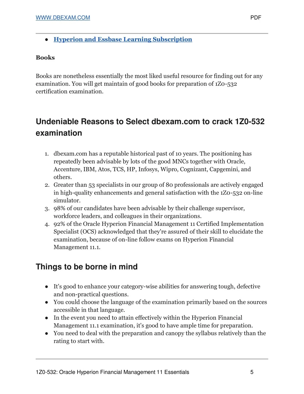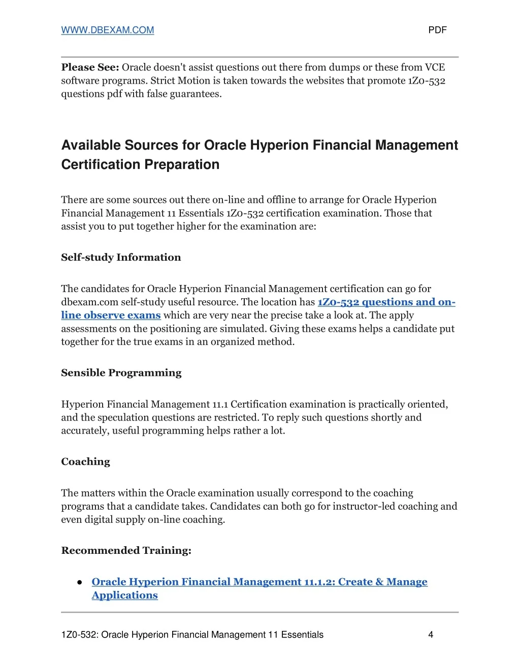 WWW.DBEXAM.COM PDF Please See: Oracle doesn't assist questions out there from dumps or these from VCE software programs. Strict Motion is taken towards the websites that promote 1Z0-532 questions pdf with false guarantees. Available Sources for Oracle Hyperion Financial Management Certification Preparation There are some sources out there on-line and offline to arrange for Oracle Hyperion Financial Management 11 Essentials 1Z0-532 certification examination. Those that assist you to put together higher for the examination are: Self-study Information The candidates for Oracle Hyperion Financial Management certification can go for dbexam.com self-study useful resource. The location has 1Z0-532 questions and on- line observe exams which are very near the precise take a look at. The apply assessments on the positioning are simulated. Giving these exams helps a candidate put together for the true exams in an organized method. Sensible Programming Hyperion Financial Management 11.1 Certification examination is practically oriented, and the speculation questions are restricted. To reply such questions shortly and accurately, useful programming helps rather a lot. Coaching The matters within the Oracle examination usually correspond to the coaching programs that a candidate takes. Candidates can both go for instructor-led coaching and even digital supply on-line coaching. Recommended Training: ●Oracle Hyperion Financial Management 11.1.2: Create & Manage Applications 1Z0-532: Oracle Hyperion Financial Management 11 Essentials 4