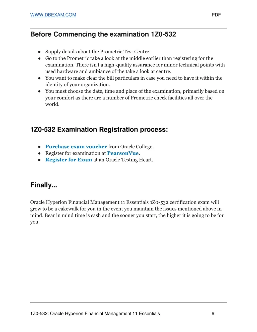 WWW.DBEXAM.COM PDF Before Commencing the examination 1Z0-532 ●Supply details about the Prometric Test Centre. ●Go to the Prometric take a look at the middle earlier than registering for the examination. There isn't a high-quality assurance for minor technical points with used hardware and ambiance of the take a look at centre. ●You want to make clear the bill particulars in case you need to have it within the identity of your organization. ●You must choose the date, time and place of the examination, primarily based on your comfort as there are a number of Prometric check facilities all over the world. 1Z0-532 Examination Registration process: ●Purchase exam voucher from Oracle College. ●Register for examination at PearsonVue. ●Register for Exam at an Oracle Testing Heart. Finally... Oracle Hyperion Financial Management 11 Essentials 1Z0-532 certification exam will grow to be a cakewalk for you in the event you maintain the issues mentioned above in mind. Bear in mind time is cash and the sooner you start, the higher it is going to be for you. 1Z0-532: Oracle Hyperion Financial Management 11 Essentials 6
