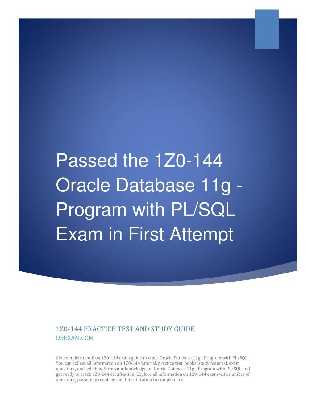 Passed the 1Z0-144 Oracle Database 11g - Program with PL/SQL Exam in First Attempt 1Z0-144 PRACTICE TEST AND STUDY GUIDE DBEXAM.COM Get complete detail on 1Z0-144 exam guide to crack Oracle Database 11g - Program with PL/SQL. You can collect all information on 1Z0-144 tutorial, practice test, books, study material, exam questions, and syllabus. Firm your knowledge on Oracle Database 11g - Program with PL/SQL and get ready to crack 1Z0-144 certification. Explore all information on 1Z0-144 exam with number of questions, passing percentage and time duration to complete test.