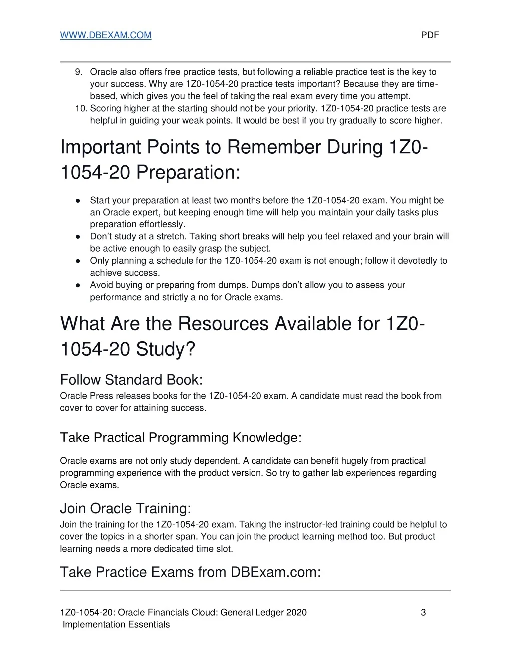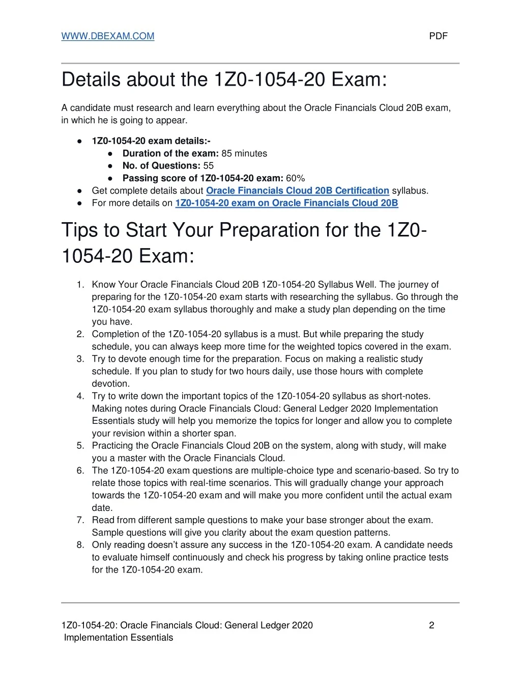 WWW.DBEXAM.COM PDF Details about the 1Z0-1054-20 Exam: A candidate must research and learn everything about the Oracle Financials Cloud 20B exam, in which he is going to appear. ●1Z0-1054-20 exam details:- ●Duration of the exam: 85 minutes ●No. of Questions: 55 ●Passing score of 1Z0-1054-20 exam: 60% ● Get complete details about Oracle Financials Cloud 20B Certification syllabus. ● For more details on 1Z0-1054-20 exam on Oracle Financials Cloud 20B Tips to Start Your Preparation for the 1Z0- 1054-20 Exam: 1. Know Your Oracle Financials Cloud 20B 1Z0-1054-20 Syllabus Well. The journey of preparing for the 1Z0-1054-20 exam starts with researching the syllabus. Go through the 1Z0-1054-20 exam syllabus thoroughly and make a study plan depending on the time you have. 2. Completion of the 1Z0-1054-20 syllabus is a must. But while preparing the study schedule, you can always keep more time for the weighted topics covered in the exam. 3. Try to devote enough time for the preparation. Focus on making a realistic study schedule. If you plan to study for two hours daily, use those hours with complete devotion. 4. Try to write down the important topics of the 1Z0-1054-20 syllabus as short-notes. Making notes during Oracle Financials Cloud: General Ledger 2020 Implementation Essentials study will help you memorize the topics for longer and allow you to complete your revision within a shorter span. 5. Practicing the Oracle Financials Cloud 20B on the system, along with study, will make you a master with the Oracle Financials Cloud. 6. The 1Z0-1054-20 exam questions are multiple-choice type and scenario-based. So try to relate those topics with real-time scenarios. This will gradually change your approach towards the 1Z0-1054-20 exam and will make you more confident until the actual exam date. 7. Read from different sample questions to make your base stronger about the exam. Sample questions will give you clarity about the exam question patterns. 8. Only reading doesn’t assure any success in the 1Z0-1054-20 exam. A candidate needs to evaluate himself continuously and check his progress by taking online practice tests for the 1Z0-1054-20 exam. 1Z0-1054-20: Oracle Financials Cloud: General Ledger 2020 Implementation Essentials 2