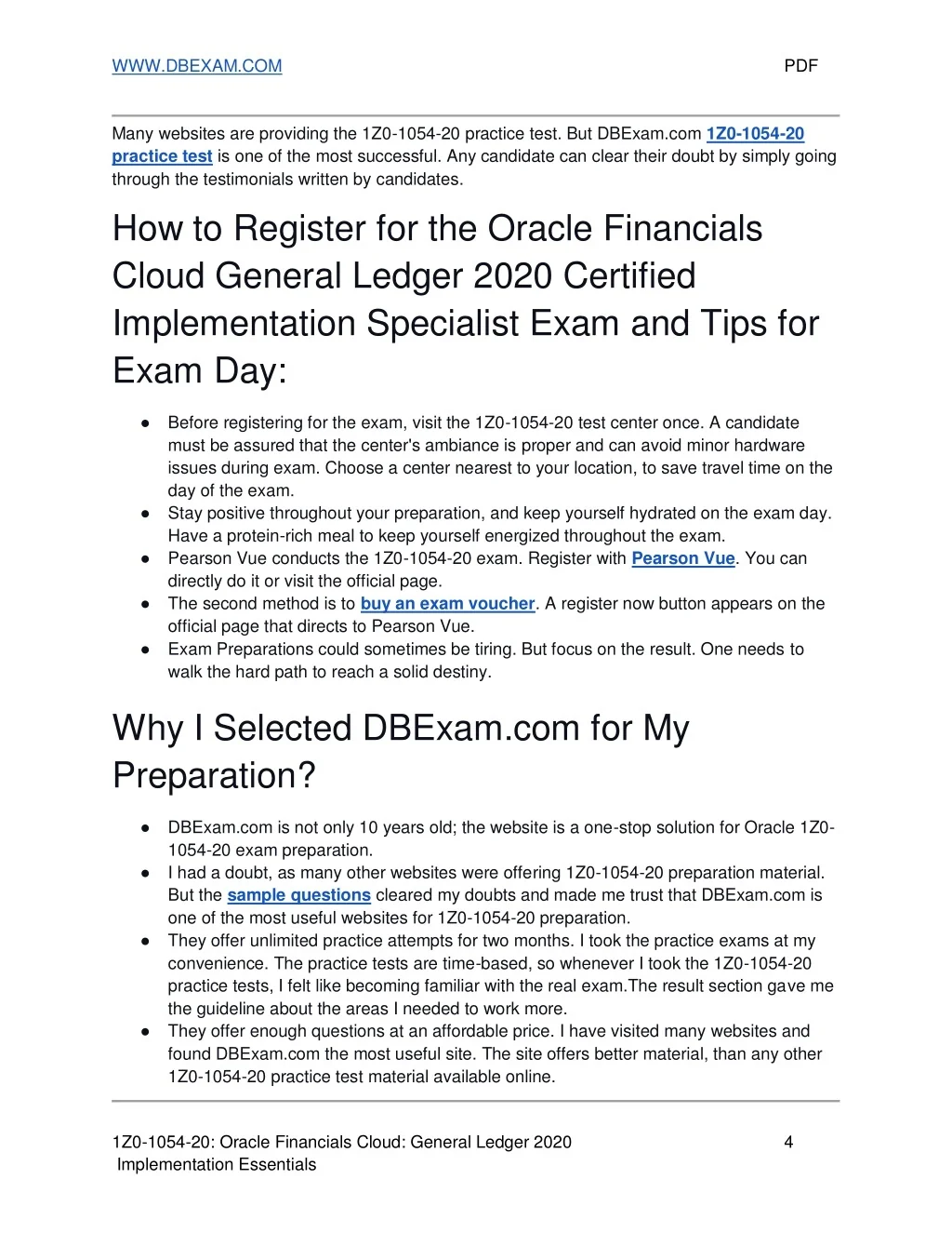 WWW.DBEXAM.COM PDF Many websites are providing the 1Z0-1054-20 practice test. But DBExam.com 1Z0-1054-20 practice test is one of the most successful. Any candidate can clear their doubt by simply going through the testimonials written by candidates. How to Register for the Oracle Financials Cloud General Ledger 2020 Certified Implementation Specialist Exam and Tips for Exam Day: ● Before registering for the exam, visit the 1Z0-1054-20 test center once. A candidate must be assured that the center's ambiance is proper and can avoid minor hardware issues during exam. Choose a center nearest to your location, to save travel time on the day of the exam. ● Stay positive throughout your preparation, and keep yourself hydrated on the exam day. Have a protein-rich meal to keep yourself energized throughout the exam. ● Pearson Vue conducts the 1Z0-1054-20 exam. Register with Pearson Vue. You can directly do it or visit the official page. ● The second method is to buy an exam voucher. A register now button appears on the official page that directs to Pearson Vue. ● Exam Preparations could sometimes be tiring. But focus on the result. One needs to walk the hard path to reach a solid destiny. Why I Selected DBExam.com for My Preparation? ● DBExam.com is not only 10 years old; the website is a one-stop solution for Oracle 1Z0- 1054-20 exam preparation. ● I had a doubt, as many other websites were offering 1Z0-1054-20 preparation material. But the sample questions cleared my doubts and made me trust that DBExam.com is one of the most useful websites for 1Z0-1054-20 preparation. ● They offer unlimited practice attempts for two months. I took the practice exams at my convenience. The practice tests are time-based, so whenever I took the 1Z0-1054-20 practice tests, I felt like becoming familiar with the real exam.The result section gave me the guideline about the areas I needed to work more. ● They offer enough questions at an affordable price. I have visited many websites and found DBExam.com the most useful site. The site offers better material, than any other 1Z0-1054-20 practice test material available online. 1Z0-1054-20: Oracle Financials Cloud: General Ledger 2020 Implementation Essentials 4