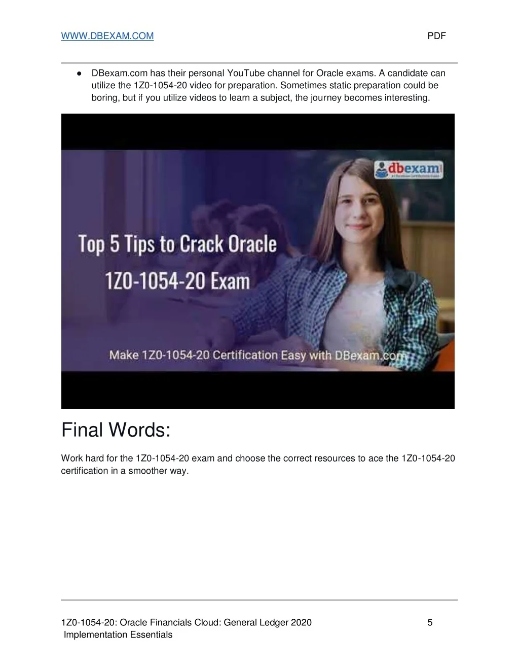 WWW.DBEXAM.COM PDF ● DBexam.com has their personal YouTube channel for Oracle exams. A candidate can utilize the 1Z0-1054-20 video for preparation. Sometimes static preparation could be boring, but if you utilize videos to learn a subject, the journey becomes interesting. Final Words: Work hard for the 1Z0-1054-20 exam and choose the correct resources to ace the 1Z0-1054-20 certification in a smoother way. 1Z0-1054-20: Oracle Financials Cloud: General Ledger 2020 Implementation Essentials 5