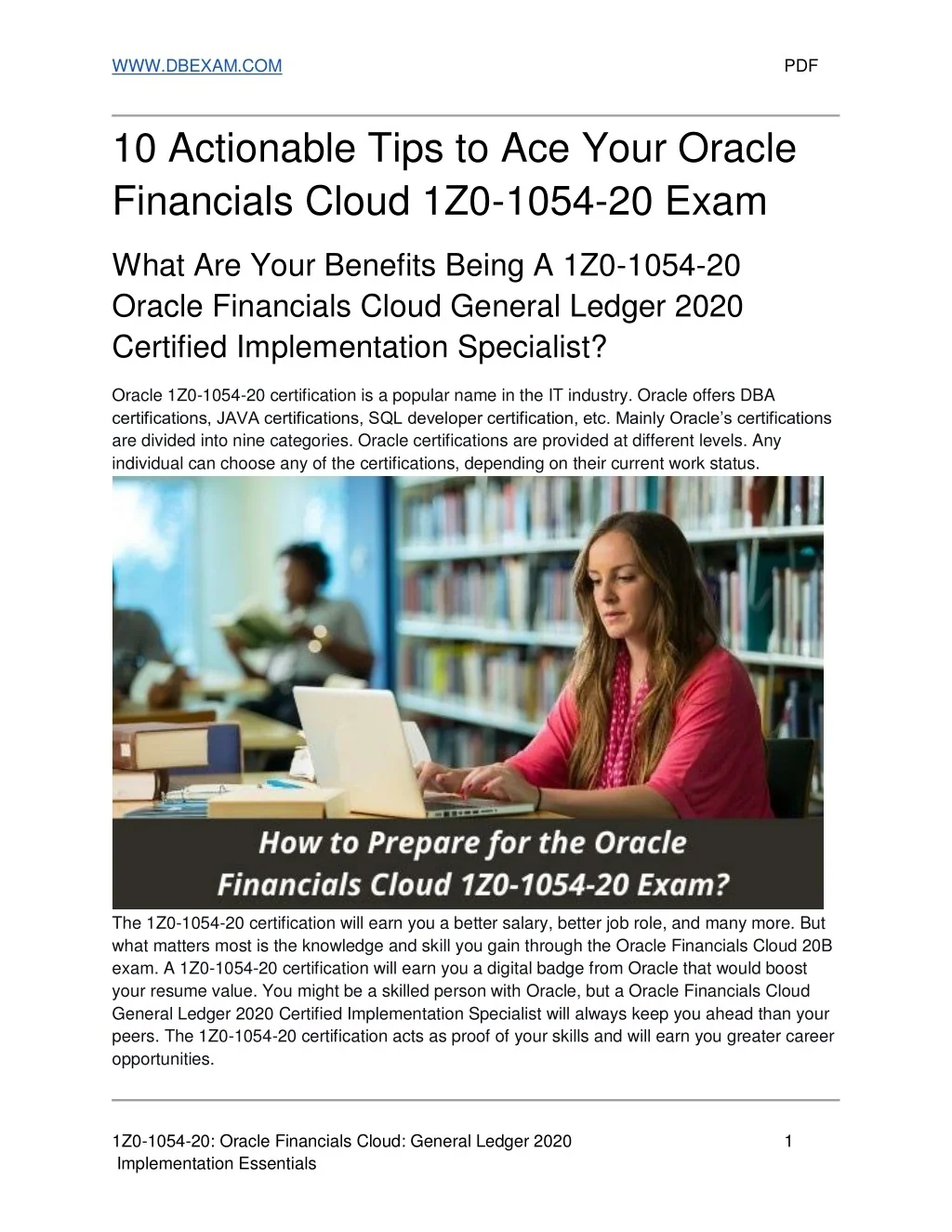 WWW.DBEXAM.COM PDF 10 Actionable Tips to Ace Your Oracle Financials Cloud 1Z0-1054-20 Exam What Are Your Benefits Being A 1Z0-1054-20 Oracle Financials Cloud General Ledger 2020 Certified Implementation Specialist? Oracle 1Z0-1054-20 certification is a popular name in the IT industry. Oracle offers DBA certifications, JAVA certifications, SQL developer certification, etc. Mainly Oracle’s certifications are divided into nine categories. Oracle certifications are provided at different levels. Any individual can choose any of the certifications, depending on their current work status. The 1Z0-1054-20 certification will earn you a better salary, better job role, and many more. But what matters most is the knowledge and skill you gain through the Oracle Financials Cloud 20B exam. A 1Z0-1054-20 certification will earn you a digital badge from Oracle that would boost your resume value. You might be a skilled person with Oracle, but a Oracle Financials Cloud General Ledger 2020 Certified Implementation Specialist will always keep you ahead than your peers. The 1Z0-1054-20 certification acts as proof of your skills and will earn you greater career opportunities. 1Z0-1054-20: Oracle Financials Cloud: General Ledger 2020 Implementation Essentials 1