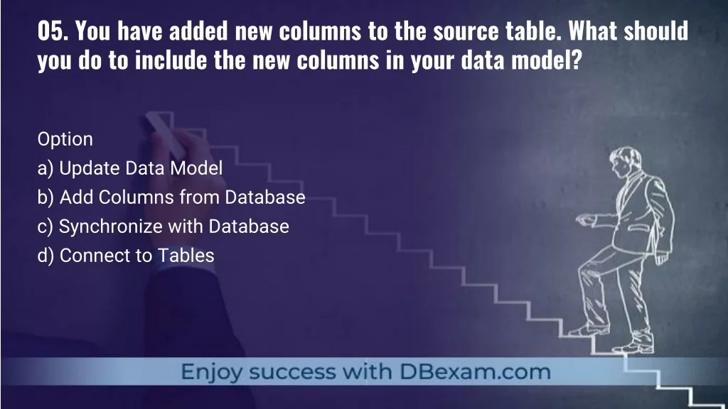 05. You have added new columns to the source table. What should you do to include the new columns in your data model? Option a) Update Data Model b) Add Columns from Database c) Synchronize with Database d) Connect to Tables