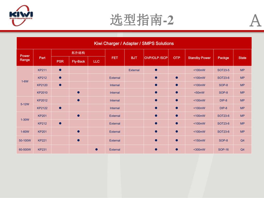 A. 选型指南 -1. A. 选型指南 -2. A. 选型指南 -3. 产品介绍 -1 《LED 照明驱动器 》-KP1030. B. 低成本 降压型 / 反激型 LED 功率开关. 主要特性. 典型应用. 超低成本 、无频闪. 集成 650V 高压 MOSFET 快速启动 <100ms 恒流精度 <+-3% 集成式内部环路补偿 高压自供电,无需辅助绕组 安全可靠的 LED 开路、短路保护 隔离和非隔离一 P in 自由选择 封装: SOP-8. LED 蜡烛灯 LED 球泡灯 LED 玉米灯、射灯 其他 LED 照明. 产品介绍 -1