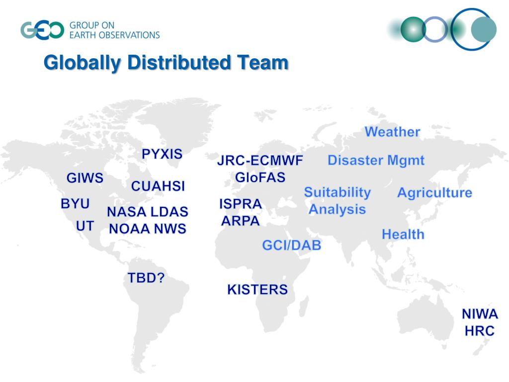 Globally Distributed Team Weather PYXIS Disaster Mgmt JRC-ECMWF GloFAS GIWS CUAHSI Suitability Analysis Agriculture BYU ISPRA ARPA NASA LDAS NOAA NWS UT Health GCI/DAB TBD? KISTERS NIWA HRC