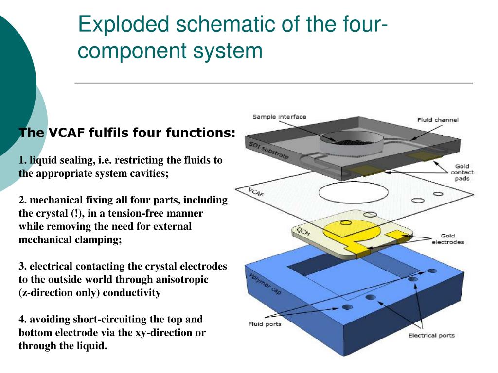 Exploded schematic of the four-component system The VCAF fulfils four functions: 1. liquid sealing, i.e. restricting the fluids to the appropriate system cavities; 2. mechanical fixing all four parts, including the crystal (!), in a tension-free manner while removing the need for external mechanical clamping; 3. electrical contacting the crystal electrodes to the outside world through anisotropic (z-direction only) conductivity 4. avoiding short-circuiting the top and bottom electrode via the xy-direction or through the liquid.