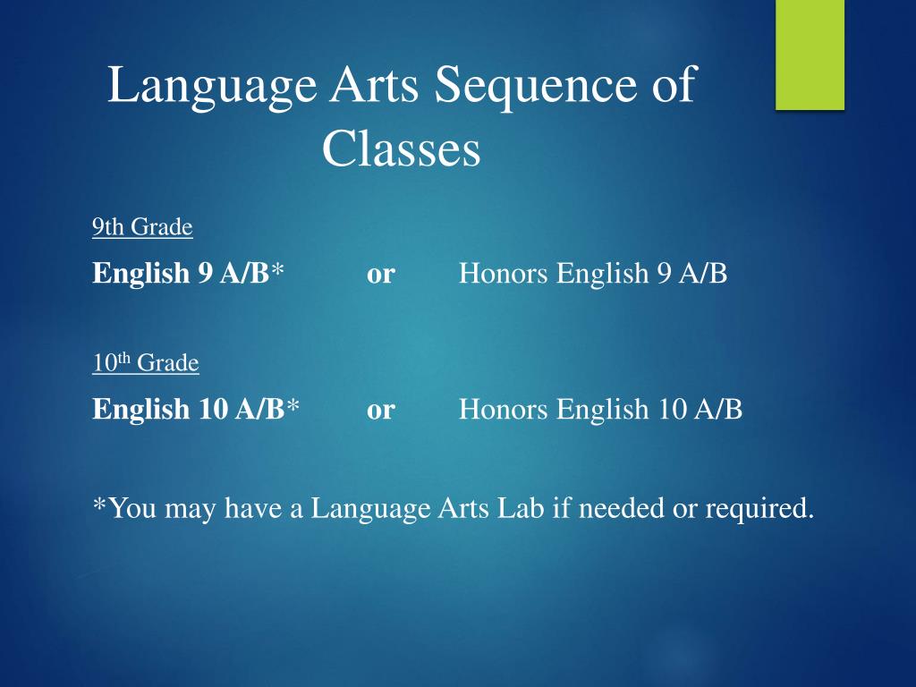 Language Arts Sequence of Classes 9th Grade English 9 A/B* or Honors English 9 A/B 10th Grade English 10 A/B* or Honors English 10 A/B *You may have a Language Arts Lab if needed or required.