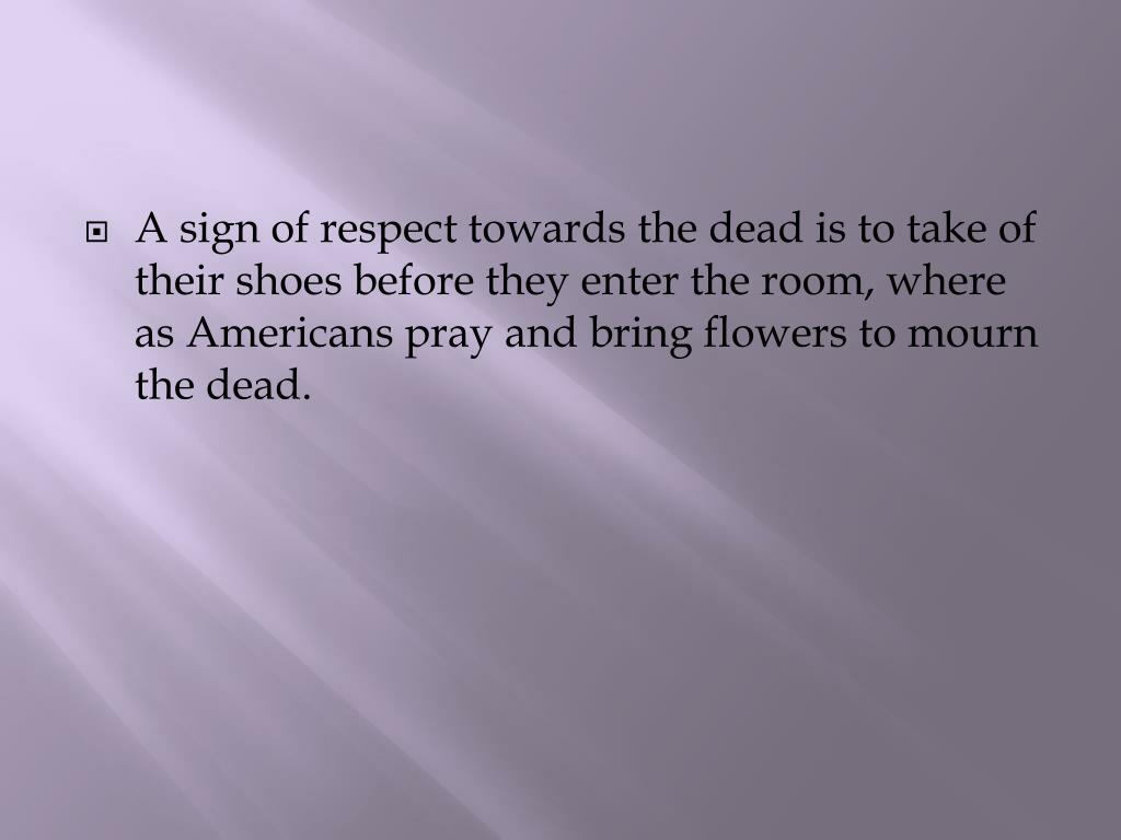 A sign of respect towards the dead is to take of their shoes before they enter the room, where as Americans pray and bring flowers to mourn the dead.