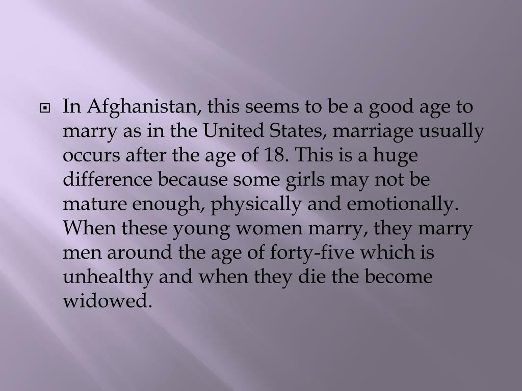 In Afghanistan, this seems to be a good age to marry as in the United States, marriage usually occurs after the age of 18. This is a huge difference because some girls may not be mature enough, physically and emotionally. When these young women marry, they marry men around the age of forty-five which is unhealthy and when they die the become widowed.