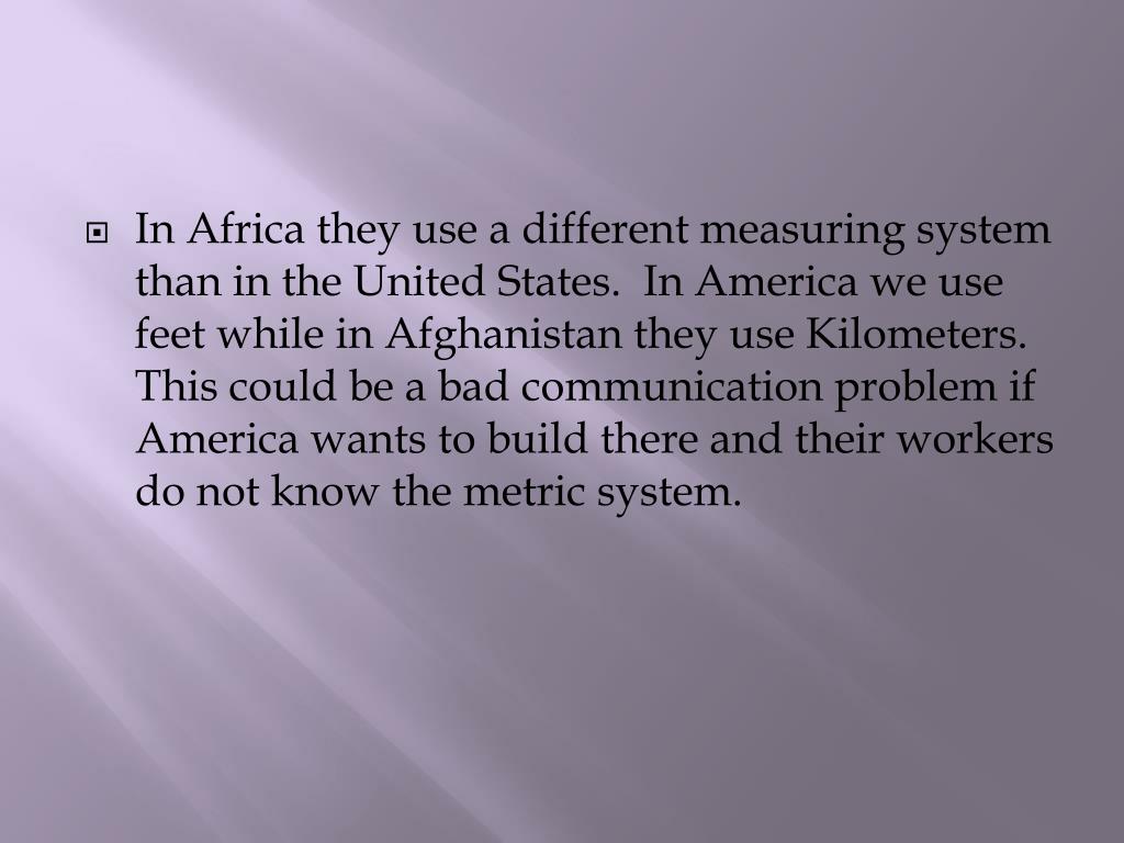 In Africa they use a different measuring system than in the United States. In America we use feet while in Afghanistan they use Kilometers. This could be a bad communication problem if America wants to build there and their workers do not know the metric system.
