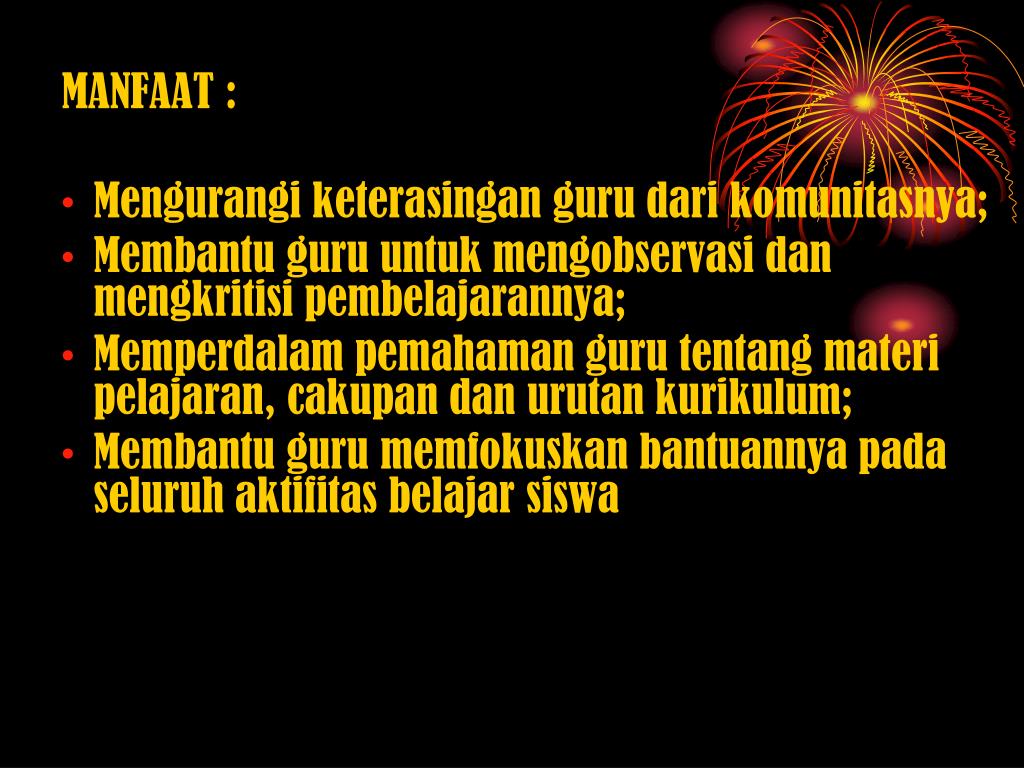 MANFAAT : • Mengurangi keterasingan guru dari komunitasnya; • Membantu guru untuk mengobservasi dan mengkritisi pembelajarannya; • Memperdalam pemahaman guru tentang materi pelajaran, cakupan dan urutan kurikulum; • Membantu guru memfokuskan bantuannya pada seluruh aktifitas belajar siswa