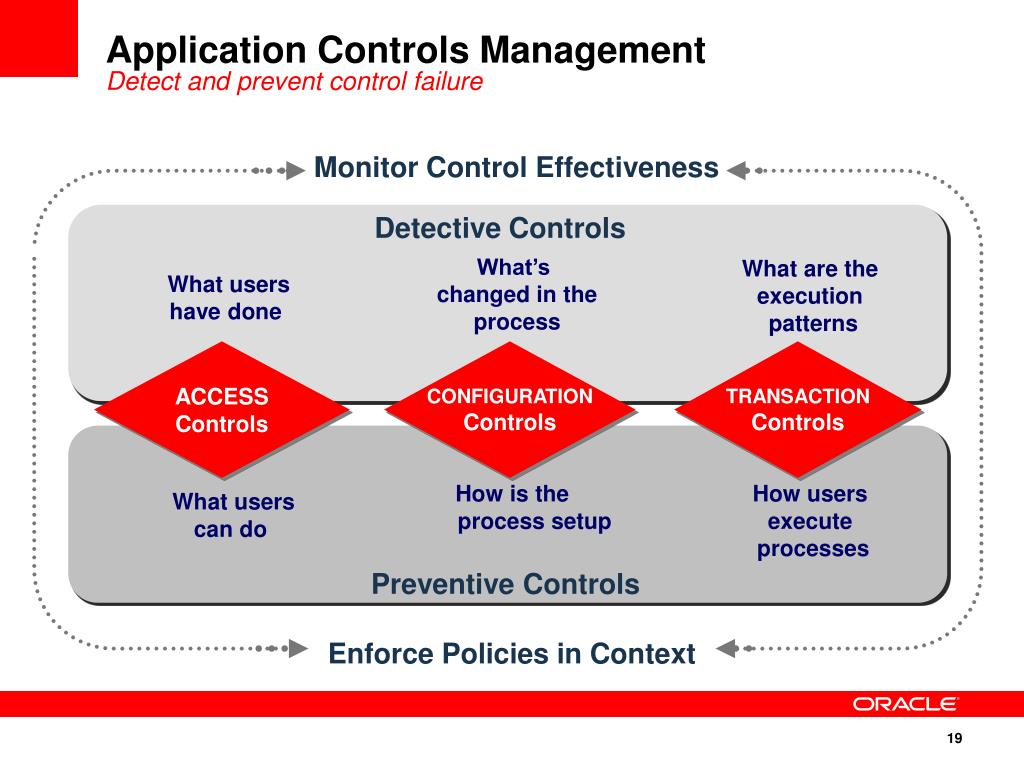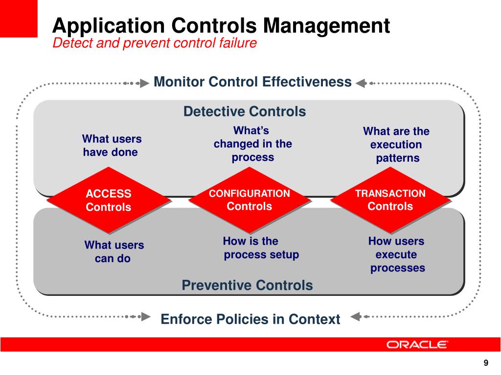 Application Configuration Controls Detect and prevent configuration control failure Ensure that critical setups conform to best practices and follow robust change management procedures Prevention Detection Define Configuration Controls Document or Compare Configurations Monitor Configuration Changes Enforce Change Control Manage Data Integrity Define best practice policies & operating rules Validate that setups and data updates conform to valid values Require conditional approval cycles (e.g., exceed threshold) Record changes to sensitive setup data. Compare before and after values for changes Monitor for setup inconsistencies across multiple instances
