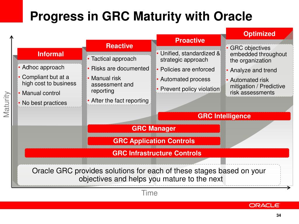 Progress in GRC Maturity with Oracle Optimized Proactive Reactive • GRC objectives embedded throughout the organization • Analyze and trend • Automated risk mitigation / Predictive risk assessments Informal • Unified, standardized & strategic approach • Policies are enforced • Automated process • Prevent policy violation • Tactical approach • Risks are documented • Manual risk assessment and reporting • After the fact reporting • Adhoc approach • Compliant but at a high cost to business • Manual control • No best practices Maturity GRC Intelligence GRC Manager GRC Application Controls GRC Infrastructure Controls Oracle GRC provides solutions for each of these stages based on your objectives and helps you mature to the next Time