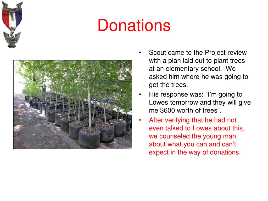 Donations • Scout came to the Project review with a plan laid out to plant trees at an elementary school. We asked him where he was going to get the trees. • His response was: “I’m going to Lowes tomorrow and they will give me $600 worth of trees”. • After verifying that he had not even talked to Lowes about this, we counseled the young man about what you can and can’t expect in the way of donations.