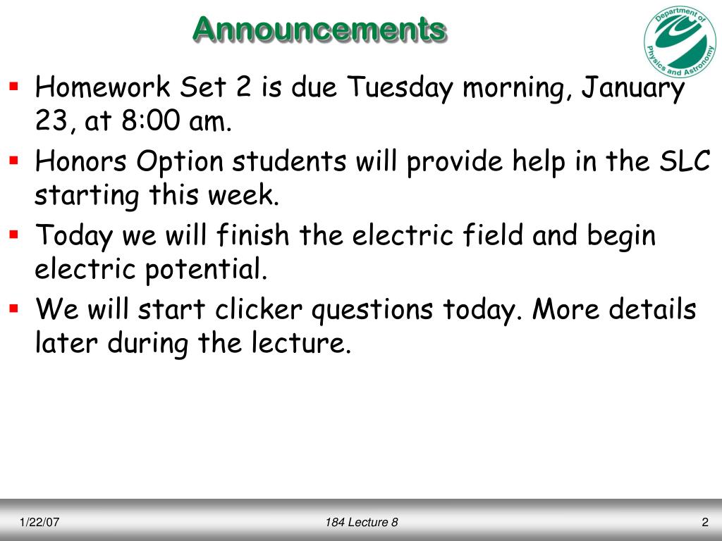 Announcements • Homework Set 2 is due Tuesday morning, January 23, at 8:00 am. • Honors Option students will provide help in the SLC starting this week. • Today we will finish the electric field and begin electric potential. • We will start clicker questions today. More details later during the lecture. 184 Lecture 8