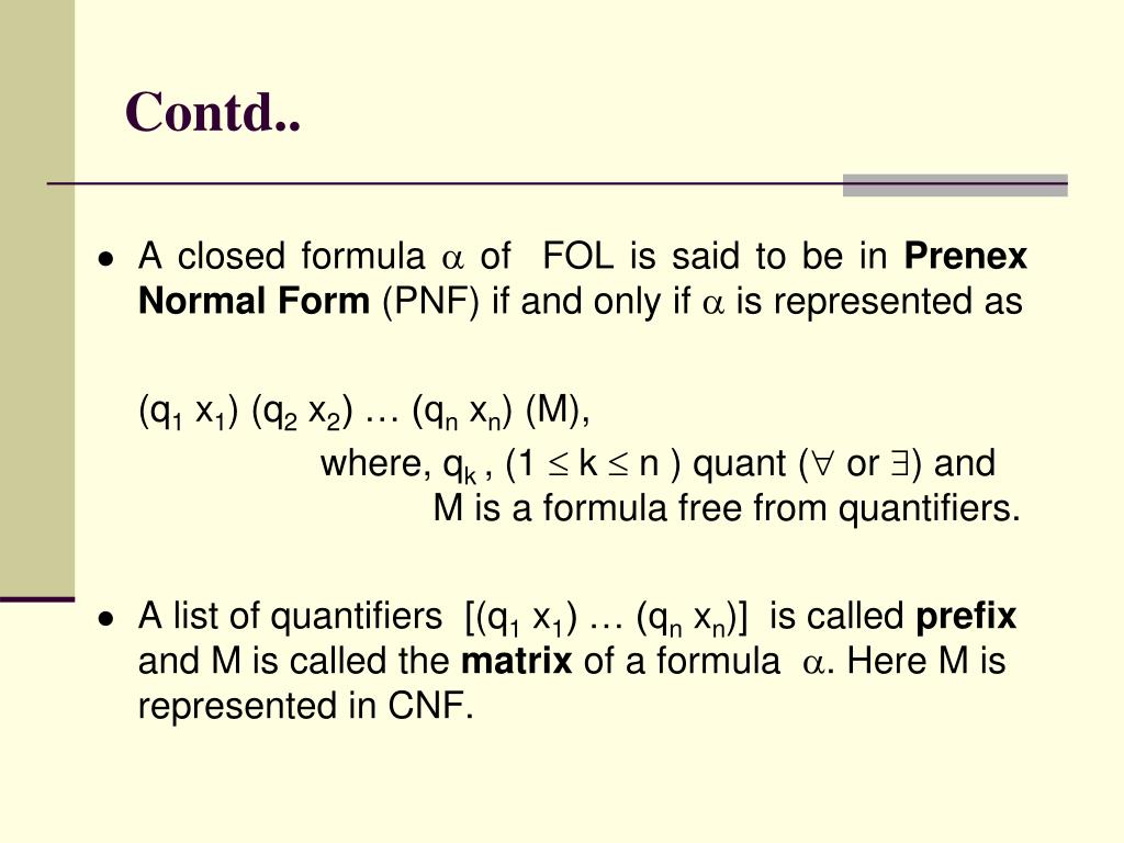 Contd.. • A closed formula of FOL is said to be in Prenex Normal Form(PNF) if and only if is represented as (q1 x1) (q2 x2) … (qn xn) (M), where, qk , (1 k n ) quant ( or ) and M is a formula free from quantifiers. • A list of quantifiers [(q1 x1) … (qn xn)] is called prefixand M is called the matrix of a formula . Here M is represented in CNF.