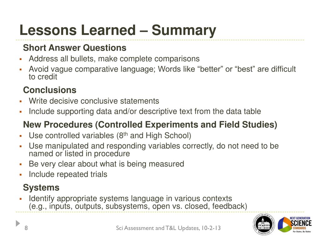 Lessons Learned – Summary Short Answer Questions • Address all bullets, make complete comparisons • Avoid vague comparative language; Words like “better” or “best” are difficult to credit Conclusions • Write decisive conclusive statements • Include supporting data and/or descriptive text from the data table New Procedures (Controlled Experiments and Field Studies) • Use controlled variables (8th and High School) • Use manipulated and responding variables correctly, do not need to be named or listed in procedure • Be very clear about what is being measured • Include repeated trials Systems • Identify appropriate systems language in various contexts (e.g., inputs, outputs, subsystems, open vs. closed, feedback) Sci Assessment and T&L Updates, 10-2-13