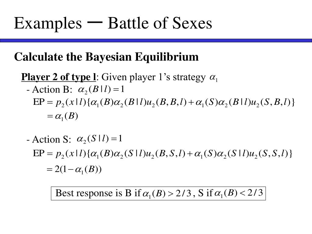 Examples ー Battle of Sexes Player 2 of type h: Given player 1’s strategy - Action B: - Action S: Best response is B if , S if