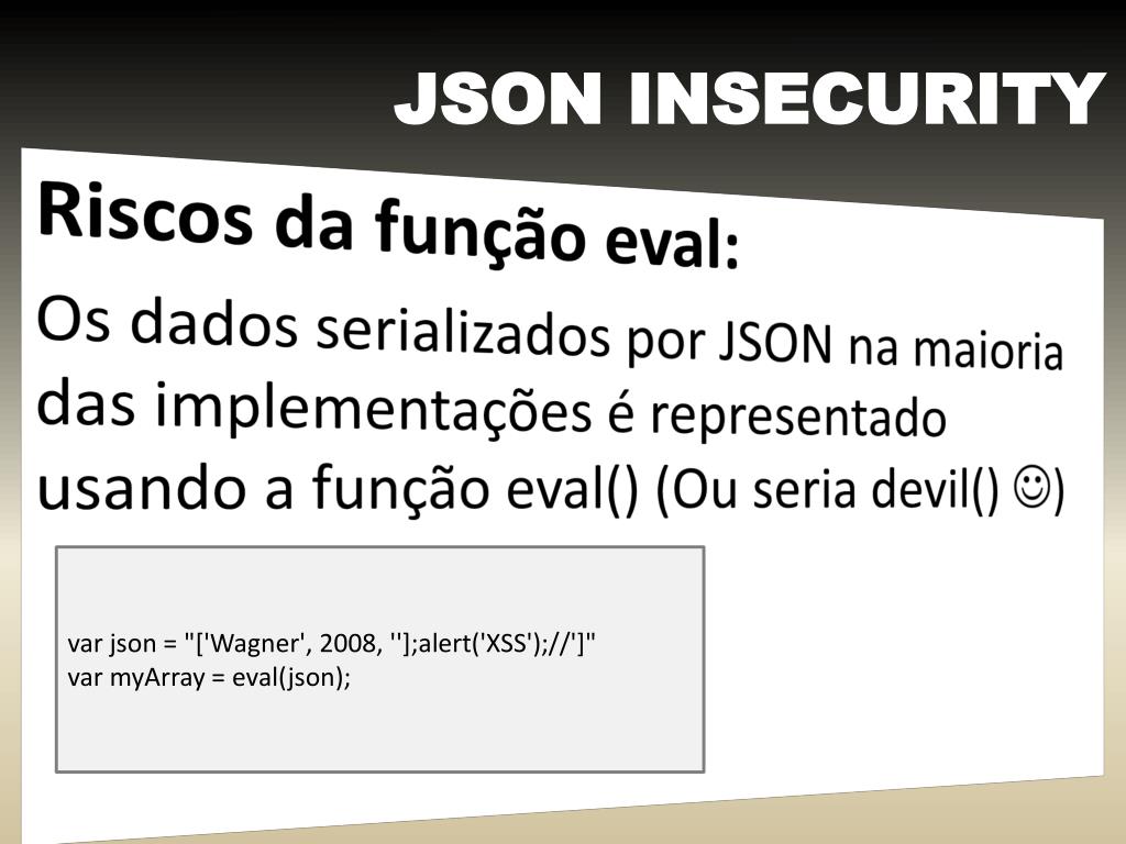 JSON INSECURITY Riscosdafunçãoeval: Os dados serializadospor JSON namaioria das implementações é representadousando a funçãoeval() (Ouseria devil() ) varjson = "['Wagner', 2008, ''];alert('XSS');//']" varmyArray = eval(json);