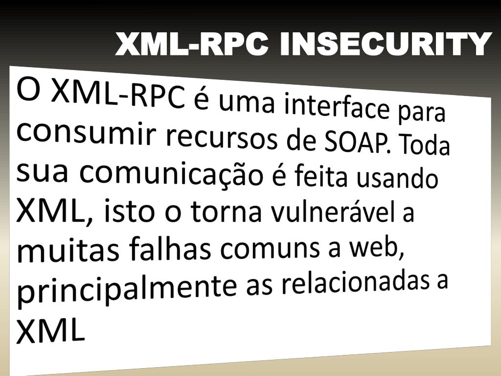XML-RPC INSECURITY O XML-RPC é uma interface paraconsumirrecursos de SOAP. Toda suacomunicação é feitausandoXML, isto o tornavulnerávela muitasfalhascomuns a web, principalmente as relacionadas a XML