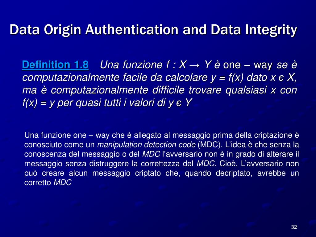 Data Origin Authentication and Data Integrity Definition 1.8Una funzione f : X → Y è one – way se è computazionalmente facile da calcolare y = f(x) dato x є X, ma è computazionalmente difficile trovare qualsiasi x con f(x) = y per quasi tutti i valori di y є Y Una funzione one – way che è allegato al messaggio prima della criptazione è conosciuto come un manipulation detection code (MDC). L’idea è che senza la conoscenza del messaggio o del MDC l’avversario non è in grado di alterare il messaggio senza distruggere la correttezza del MDC. Cioè, L’avversario non può creare alcun messaggio criptato che, quando decriptato, avrebbe un corretto MDC