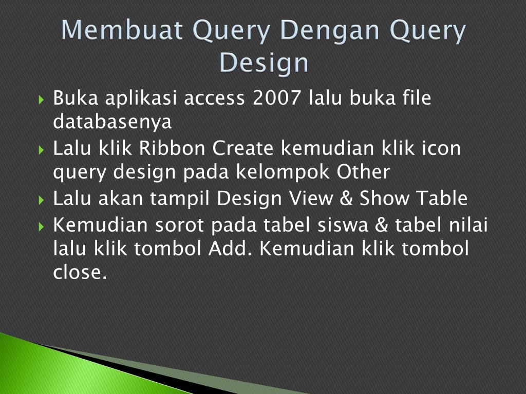 Membuat Query Dengan Query Design • Bukaaplikasi access 2007 lalubuka file databasenya • Laluklik Ribbon Create kemudianklik icon query design padakelompok Other • Laluakantampil Design View & Show Table • Kemudiansorotpadatabelsiswa & tabelnilailalukliktombol Add. Kemudiankliktombol close.