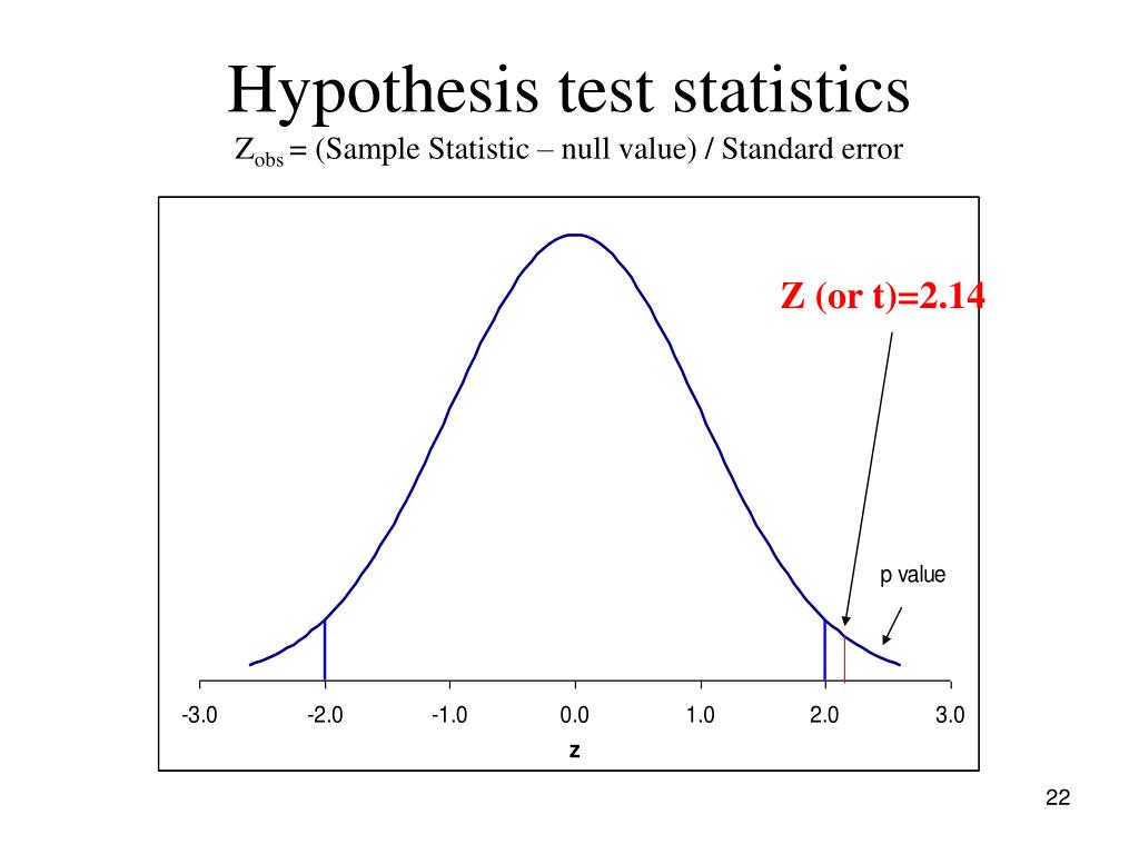Hypothesis test statisticsZobs = (Sample Statistic – null value) / Standard error Z (or t)=2.14