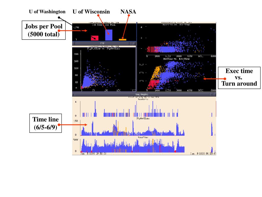 HTC on the Internet (1993) Retrieval of atmospheric temperature and humidity profiles from 18 years of data from the TOVS sensor system. • 200,000 images • ~5 minutes per image Executed on Condor pools at the University of Washington, University of Wisconsin and NASA. Controlled by DBC (Distributed Batch Controller). Execution log visualized by DEVise