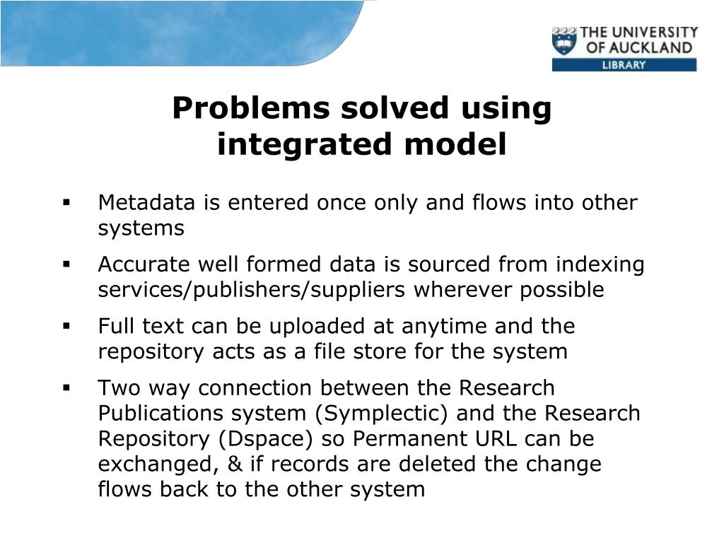 Problems solved using integrated model • Metadata is entered once only and flows into other systems • Accurate well formed data is sourced from indexing services/publishers/suppliers wherever possible • Full text can be uploaded at anytime and the repository acts as a file store for the system • Two way connection between the Research Publications system (Symplectic) and the Research Repository (Dspace) so Permanent URL can be exchanged, & if records are deleted the change flows back to the other system