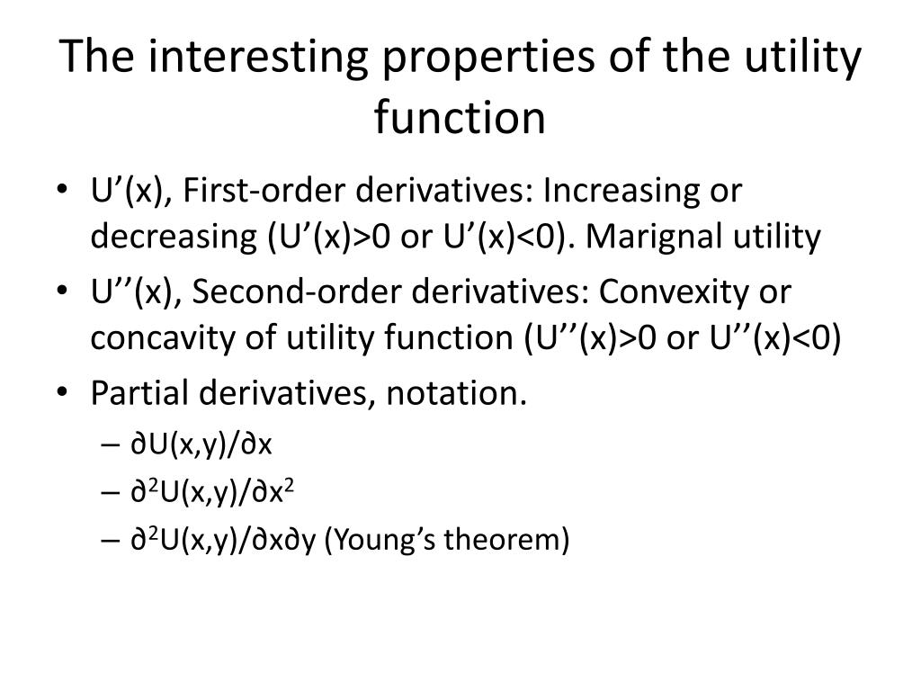The interesting properties of the utility function • U’(x), First-order derivatives: Increasing or decreasing (U’(x)>0 or U’(x)<0). Marignal utility • U’’(x), Second-order derivatives: Convexity or concavity of utility function (U’’(x)>0 or U’’(x)<0) • Partial derivatives, notation. • ∂U(x,y)/∂x • ∂2U(x,y)/∂x2 • ∂2U(x,y)/∂x∂y (Young’s theorem)