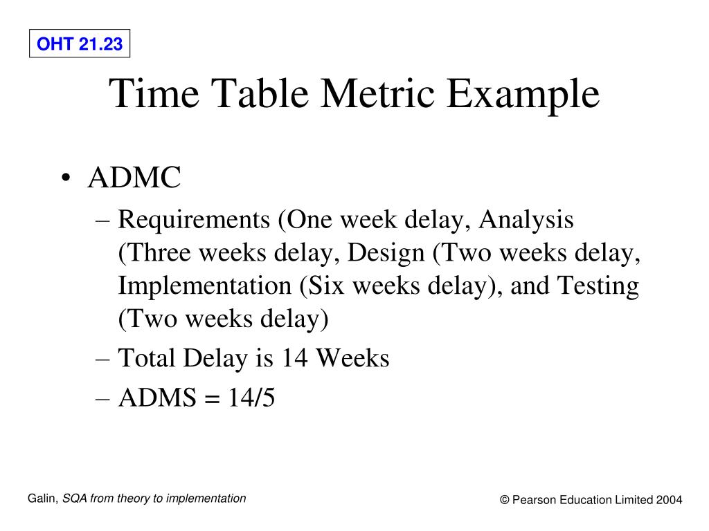 Time Table Metric Example • ADMC • Requirements (One week delay, Analysis (Three weeks delay, Design (Two weeks delay, Implementation (Six weeks delay), and Testing (Two weeks delay) • Total Delay is 14 Weeks • ADMS = 14/5