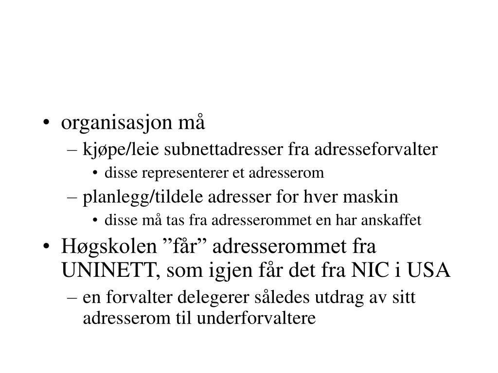 organisasjon må • kjøpe/leie subnettadresser fra adresseforvalter • disse representerer et adresserom • planlegg/tildele adresser for hver maskin • disse må tas fra adresserommet en har anskaffet • Høgskolen ”får” adresserommet fra UNINETT, som igjen får det fra NIC i USA • en forvalter delegerer således utdrag av sitt adresserom til underforvaltere