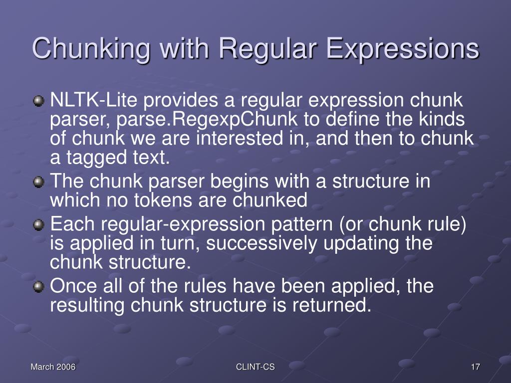 Chunking with Regular Expressions • NLTK-Lite provides a regular expression chunk parser, parse.RegexpChunk to define the kinds of chunk we are interested in, and then to chunk a tagged text. • The chunk parser begins with a structure in which no tokens are chunked • Each regular-expression pattern (or chunk rule) is applied in turn, successively updating the chunk structure. • Once all of the rules have been applied, the resulting chunk structure is returned. CLINT-CS